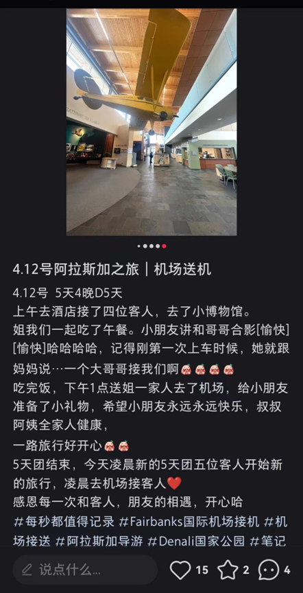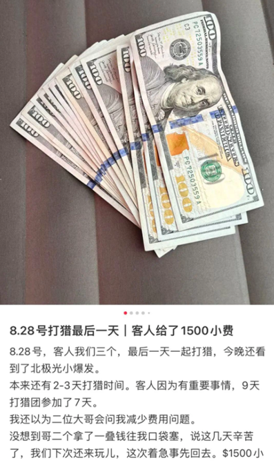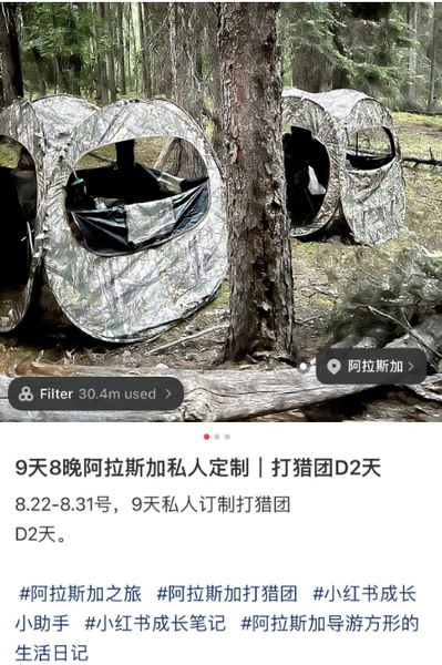 他在中国各大社交平台上发布自己的猎熊经历,吸引游客前往美国猎熊,所以跟着他后面一起快乐非法猎熊的,基本都是中国人。比如,他经常在小红书上以分享生活的形式发布广告——