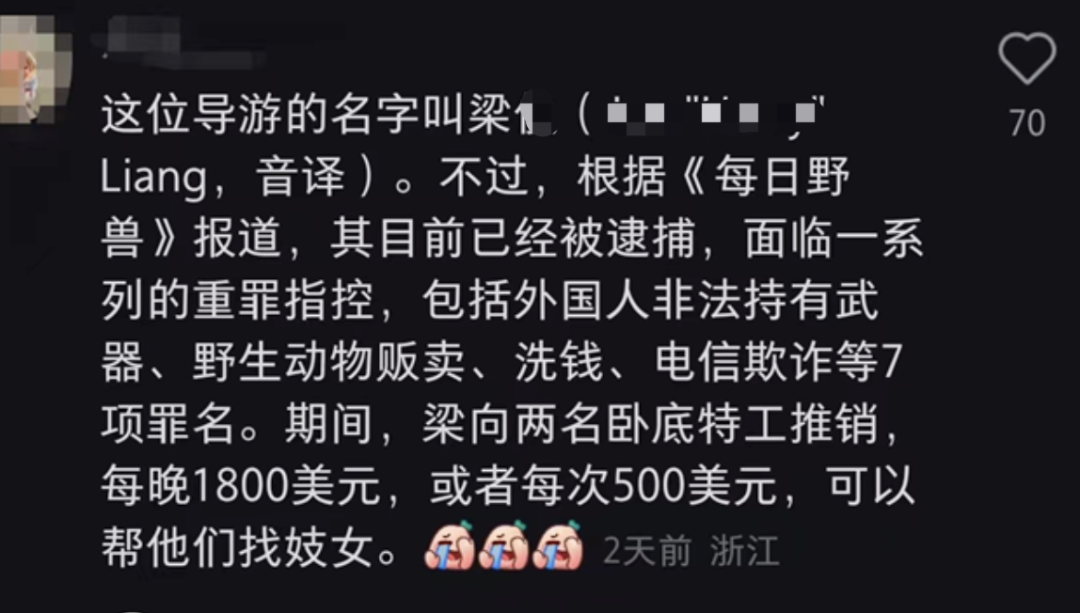 “外国人非法持有武器、野生动物贩卖、洗钱、电信欺诈”等七个罪名。Inside:中国移民提供价值60000美元的猎熊服务,还附加成人服务。The Daily Beast:妓女与熊:钓鱼行动破获大型动物狩猎计划——联邦政府称,阿拉斯加的非法探险活动以富有的中国游客为目标看这新闻标题,小伙伴们有没有感觉这种活动有种熟悉的味道?梁某最后一条小红书推文于2023年7月11日推送,