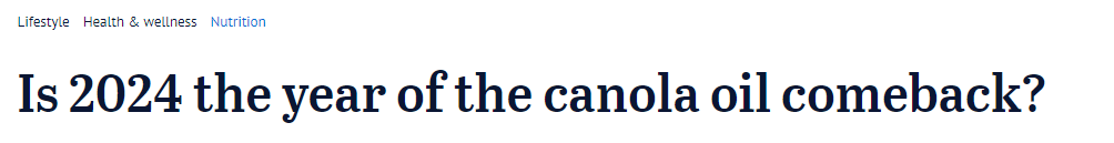 再加上一些用来制作菜籽油的作物是转基因的(约占澳大利亚作物的10%),含有亚油酸,一种Omega-6脂肪酸,当食用过量时可能会引起炎症,但也有抗炎的特性,导致一些人认为菜籽油既不天然又有毒。