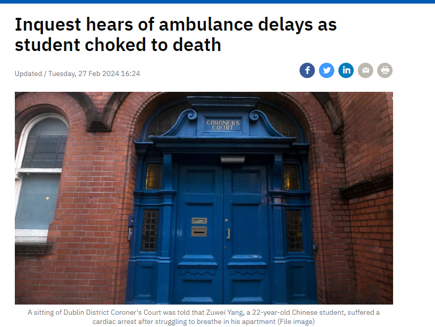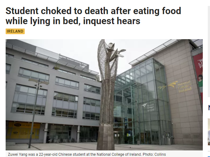 此事发生在2020年1月6日,当时22岁的中国留学生杨祖伟(Zuwei Yang,音译)在都柏林 1 区马约尔街(Mayor Street)爱尔兰国立学院学生宿舍的公寓里呼吸困难,最终导致心脏骤停。
