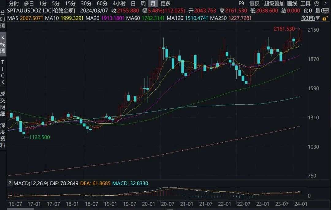 从国际、国内金价表现来看,国际现货黄金自进入三月以来,已从2043.6美元/盎司上涨至目前的2100美元/盎司,今日开盘后现货黄金直线拉升,一度升破2160美元/盎司关口,创下2161.53美元/盎司新高;而在国内,沪金主连Au9999今日收盘于505.88元,两者皆实现“五连涨”。