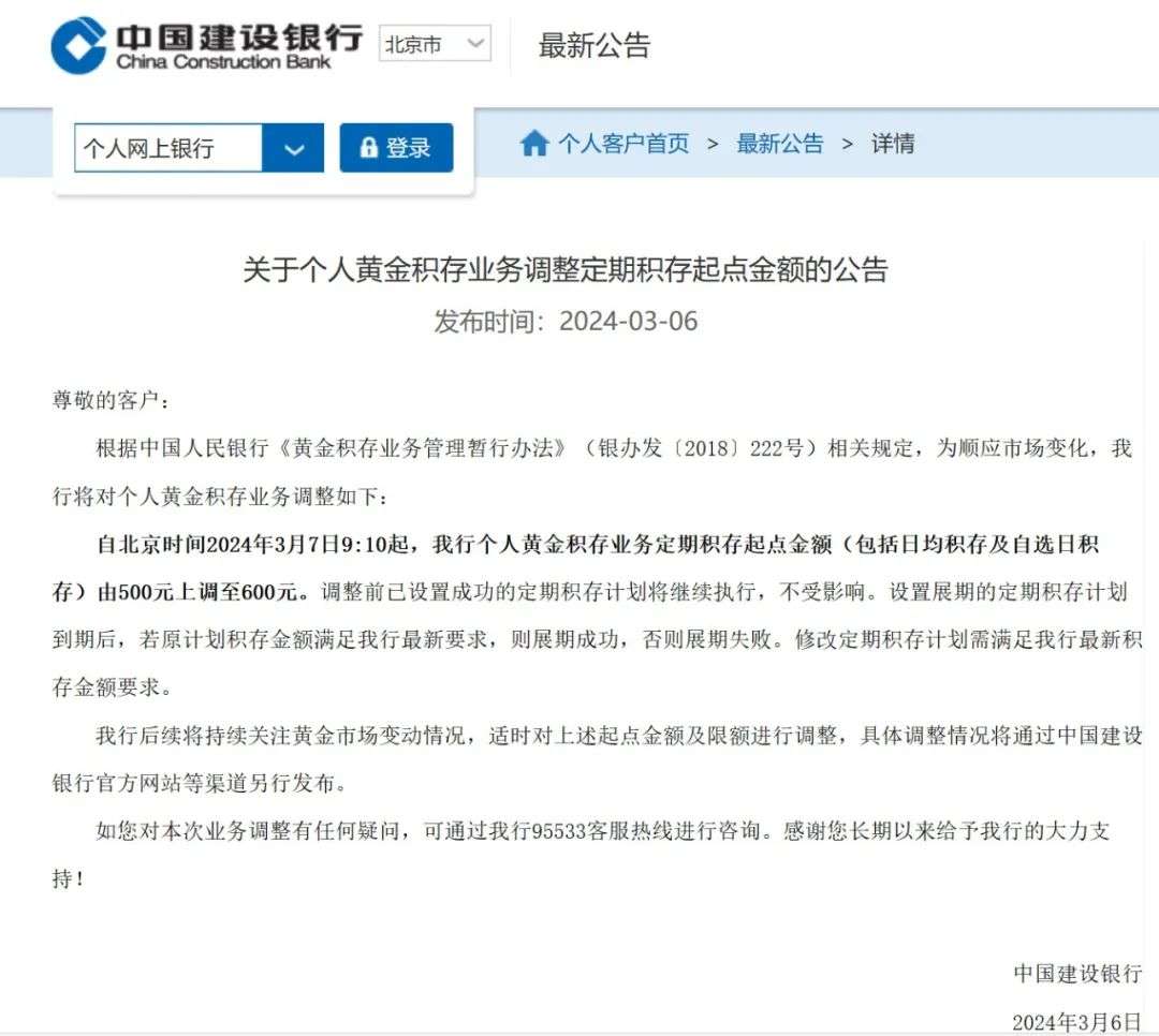 记者注意到,黄金的爆火也影响到已开设个人黄金业务的银行。建设银行公告称,为顺应市场变化,自3月7日9点10分起,将该行个人黄金积存业务定期积存起点金额由500元上调至600元。