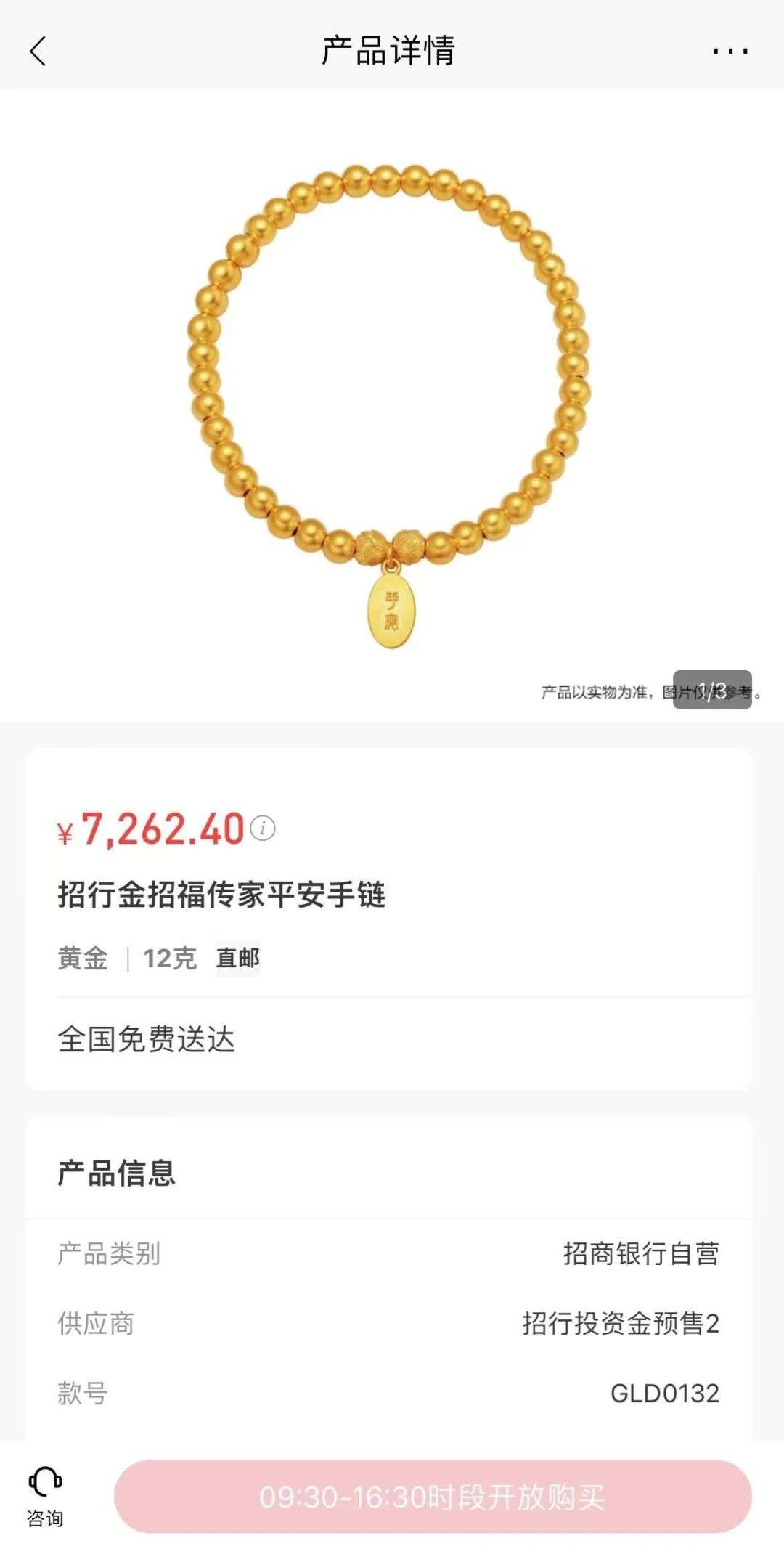 “饰品金您可以点开APP查看,品类特别多。”招行一理财经理对记者表示。记者注意到,招行APP上便有生肖金、饰品、纪念币等多个类型的黄金制品。如招行的一款“金招福传家平安手链”,重12克,售价为7262.40元,产品类别为招商银行自营,材质为足金999。