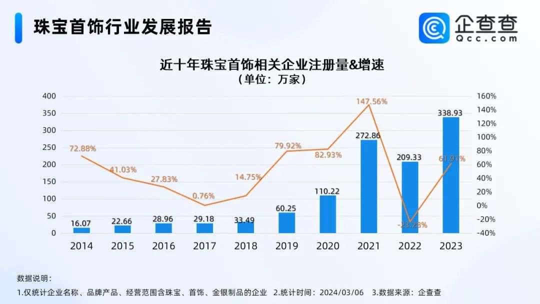 2022年,我国珠宝首饰相关企业注册量达209.33万家,同比减少23.28%。2023年,我国珠宝首饰相关企业注册量达338.93万家,同比增长达61.91%。