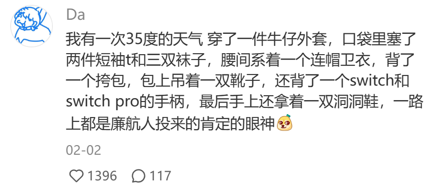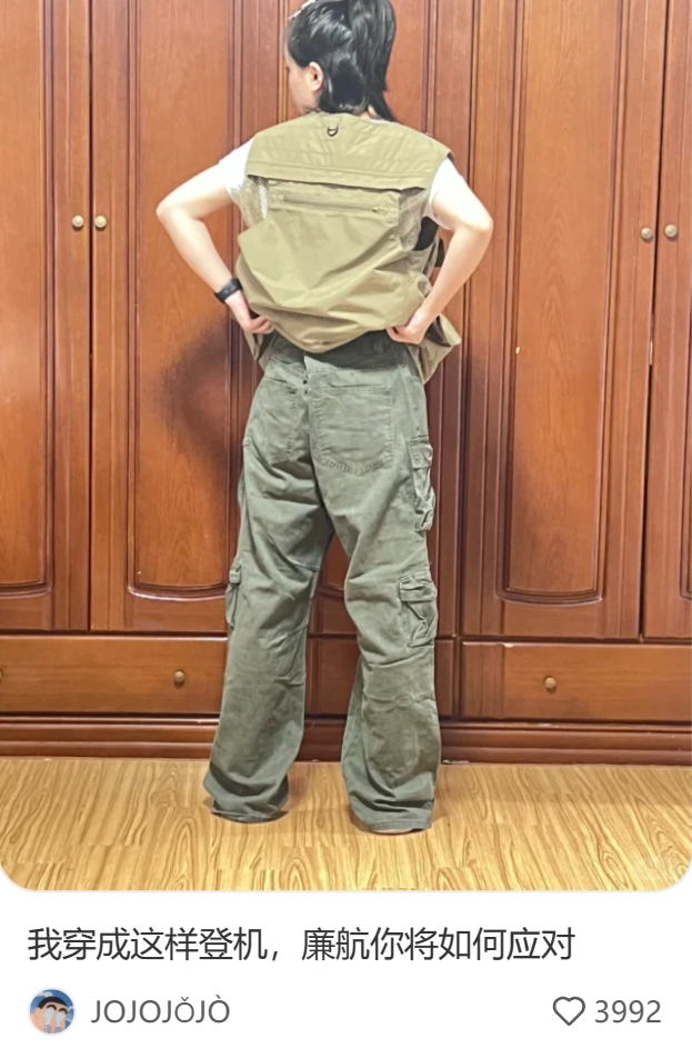 每一个尝试“廉航穿搭”的人都会短暂变成衣柜.ZIP,等待着飞机落地后解压,又是是一条好汉。