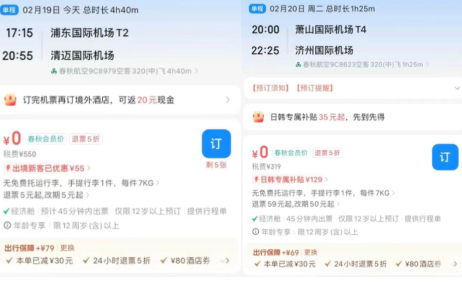上海到泰国清迈、杭州到济州岛的部分机票价格,显示为0元。