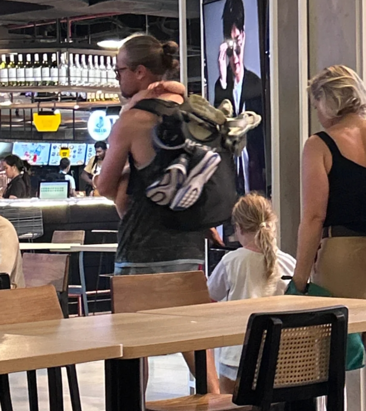 没想到等到他起身后还发现,老哥胸前还抱了一个娃。