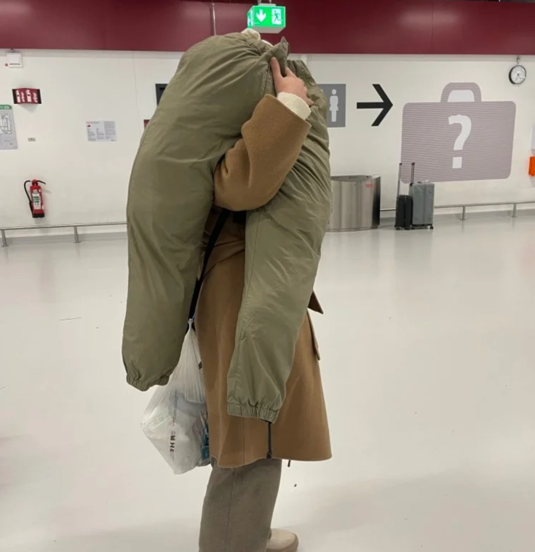 如果你在机场看到有人打开了行李箱,正在往自己身上套三层外套、两层裤子、三双袜子。