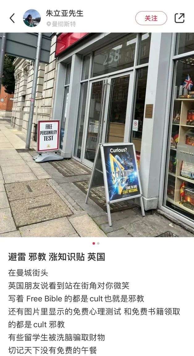 就例如英国的曼彻斯特附近,经常会看到Free Bible或者Free XX招牌的,这些很有可能是邪教组织,毕竟天下没有免费的午餐,很有可能是打着免费的招牌盘算更大的阴谋。