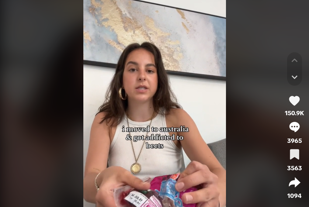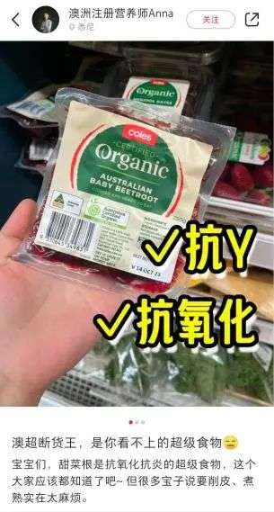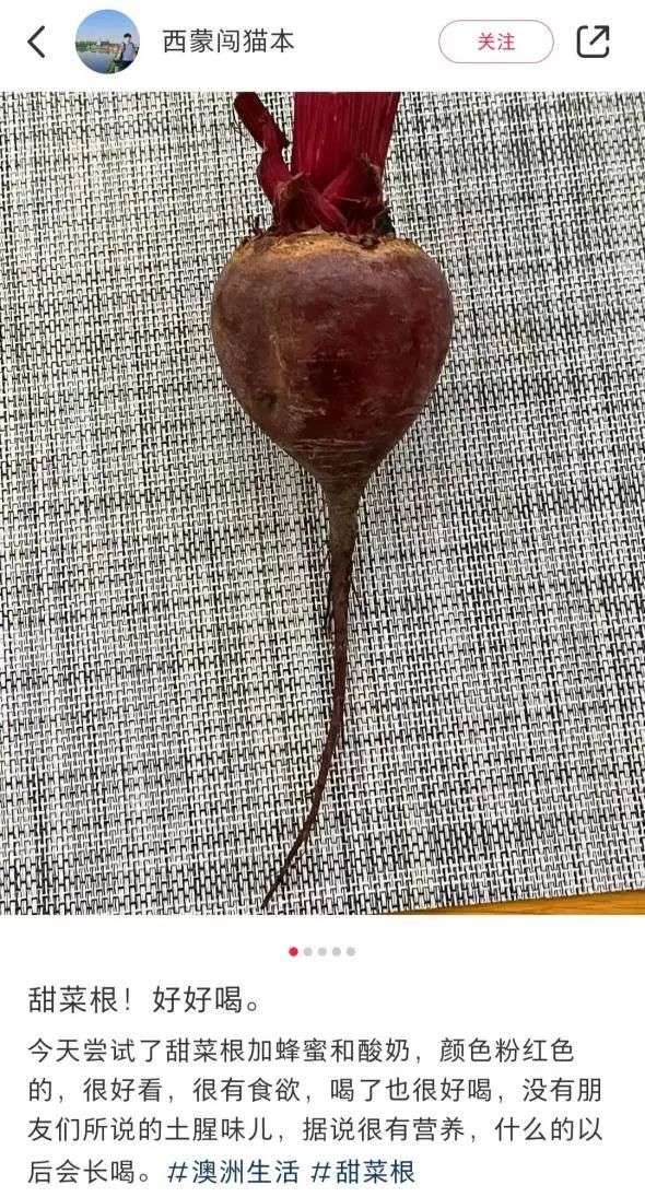 最近,TikTok上一位博主发布的关于她吃甜菜根上瘾的视频爆火,获得超过15万人点赞,近4000条评论。据这位博主说,她一个月前刚从美国搬来澳洲,然后就对澳洲的甜菜根上瘾了。“上周我去新西兰旅行,脑子里想的全是甜菜根甜菜根甜菜根。”“昨天晚饭我吃了甜菜根沙拉,今天早饭吃了甜菜根和酸奶,午餐我还是想吃甜菜根。”“我太爱甜菜根了,吃啥都要配甜菜根,汉堡、披萨、沙拉……就连咖啡里都加甜菜根的汁。”“我还以为我得了肠癌和膀胱癌,直到我意识到我前一天吃了10个甜菜根。”“我最爱吃的三明治就是新鲜面包+黄油+甜菜根片和白胡椒!非常好吃,相信我!”和澳洲人对甜菜根的钟爱不同,华人对甜菜根的态度比较两极化。有人表示,压根不知道甜菜根是啥,当成洋芋买回了家,结果味道令人难以下咽,都不知道谁爱吃这玩意。不过也有人表示:甜菜根非常好吃,觉得难吃是因为做法不对。如果这些方法都接受不了,还可以到Coles买现成的甜菜根粉冲水喝,既补气血又抗氧化。澳洲一位注册营养师也给大家推荐甜菜根,抗炎、抗氧化、抗癌、增强免疫力等等,功效多多。