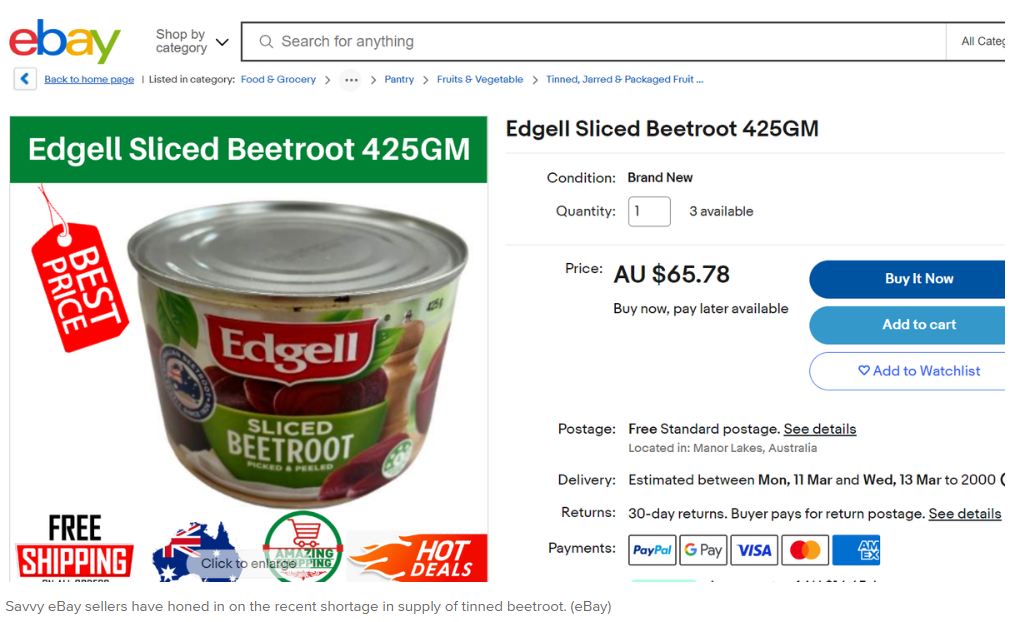 墨尔本吃喝玩乐 2024-03-11 11:30 最近,全澳各大媒体都在报道,澳洲各超市有一种热销商品断货了。Coles和Woolworths全澳各门店的货架区空空荡荡,没有一件商品。它就是华人不喜欢吃、甚至有些人不知道是啥/咋吃,但澳洲人非常喜欢吃、有人甚至吃上瘾的,还被称为“欧洲灵芝”,拥有美容养颜、润肠通便、降血压、降血糖、抗炎、抗癌、补铁等多种神奇功效的宝藏蔬菜——甜菜根。据多家澳媒报道,最近一段时间,全澳的超市都出现了甜菜根短缺,罐装甜菜根的货架空空如也,这种情况已经持续了6个多月。自二战之后一直在新州种植甜菜根的农民Ed Fagan说:“这么多年,我从来没见过(加工)甜菜根像现在这样短缺。”上一财年,澳洲国内的甜菜根产量增长了10%,达到16,167吨。既然甜菜根产量增加了,那罐装的甜菜根为什么还会短缺呢?2008年,美国食品巨头Kraft Heinz收购了澳洲罐装甜菜根的加工厂Golden Circle,并于2011年关停了布里斯班的甜菜根加工厂,将工厂迁到了新西兰。但去年 2 月,飓风造成毁灭性的洪水和山体滑坡摧毁了新西兰加工厂的生产区。13个月过去了,Golden Circle的罐装甜菜根依然没有在澳洲上架。再加上其他一些甜菜根加工厂也搬到了海外,导致本地甜菜根供应很容易受到影响。澳洲蔬菜行业顶级机构AUSVEG的Andrew MacDonald表示,作为罐头或加工蔬菜产品的进口国,澳洲经常受到国际供应链因素的影响,“这种情况凸显了提高澳洲食品制造和加工能力,满足国内需求的重要性”。由于罐装甜菜根短缺,一些精明的卖家瞅准了这一商机,开始在eBay上高价出售罐装甜菜根。价格高到你都不敢想象——一罐425g的标准装Edgells甜菜根片,售价高达65.78澳元!一罐450g的Golden Circle甜菜根,售价37.88澳元!要知道,一罐标准装的甜菜根片平时在Woolworths和Coles的零售价也就2.35- 5.90澳元。这对于喜欢吃甜菜根的人、尤其是对甜菜根上瘾的人可不是什么好消息。