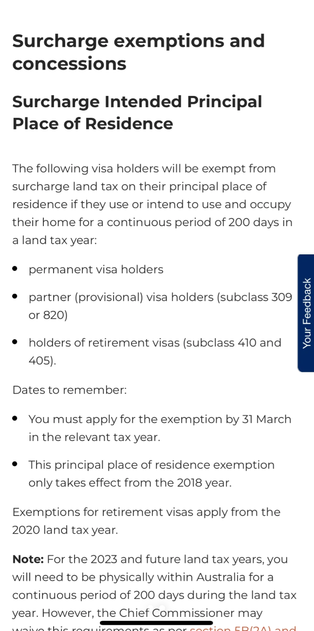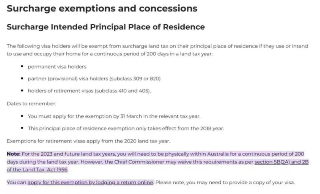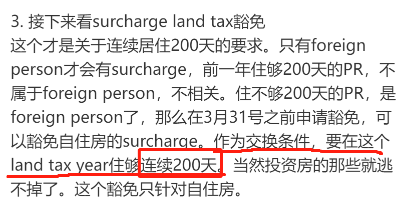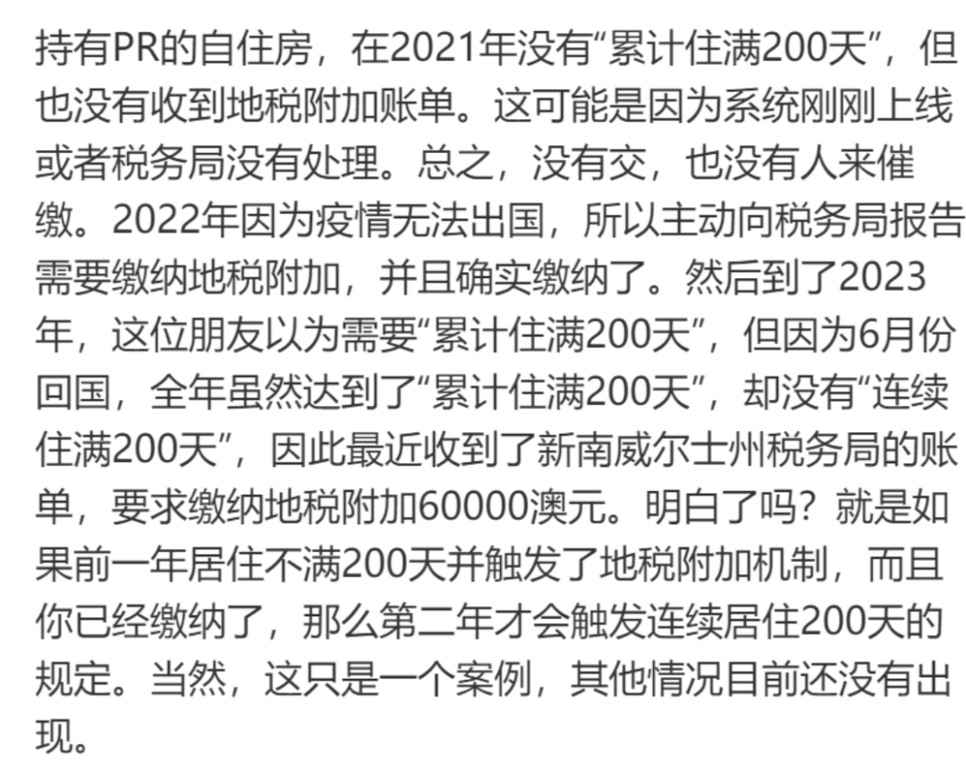 到了2022年,疫情来袭,由于边境封控,这名华人无法从中国返回澳洲。他主动申报并缴纳了土地附加税。而在2023年,这名华人在返回中国3周后回澳,总共离境21天,在澳洲住满了344天,却依旧被“要求缴纳土地附加税60000澳元”。2024年,新州对土地附加税政策进行了修改。新的要求显示,如果买家前一年没有满足“累计住满200天”,那么要在下一个Land Tax Year内满足“连续住满200天”才可以申请土地附加税的豁免。