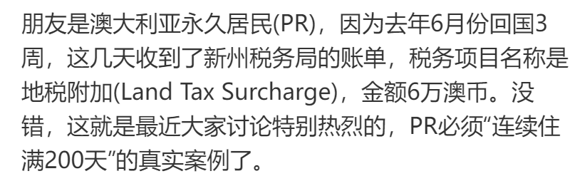 有华人回国3周被罚了60000澳元,澳洲土地附加税常被买家忽略。2024年,新州土地附加税政策有变动,“连续住满200天”条款引发无数华人讨论。小伙伴们一定要理解政策,计算好出境时间,别交“冤枉钱”。