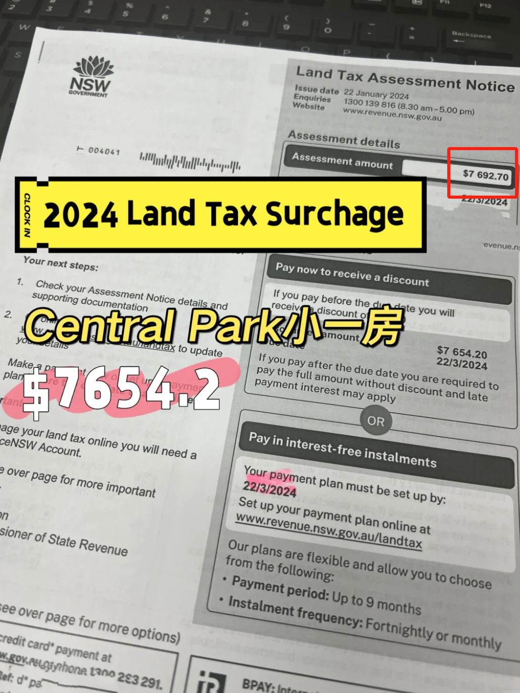 显然,这名没有在2022年累计住满200天的华人,同时也没有满足在2023年连续住满200天,那么收到60000澳元的税务账单也就在所难免了。阿南表示,这名华人朋友目前已向新州税务局提出了申诉。税务局对此表示,“必须先交这60000澳元”,等到该华人在2024年“连续住满200天”后,才会将这笔土地附加税退还。不止是这名华人朋友,另有两名华人小伙伴在社交媒体“小红书”上发帖表示,自己也被新州政府征收了土地附加税。其中一名华人称,自己的年收入才5位数,却在2024年被征收了6位数的土地附加税,并表示“税务局疯了”。另一名华人小伙伴在悉尼Central Park拥有一套50多平米的小房产,在2024年,她却被征收了7600多澳元的土地附加税——所有华人买家需要注意,对于需要缴税的海外业主而言,附加土地税意味着每年一笔不小的额外开支,因此有必要认真考量持有房产的长期成本。