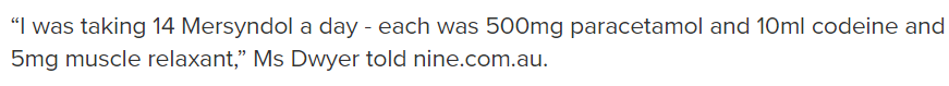 她每天都必须服用14粒Mersyndol,每粒都含有500毫克扑热息痛、10毫升可待因和5毫克肌肉松弛剂。”