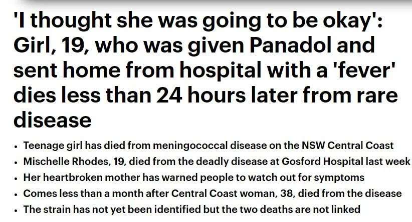 一位新洲的19岁女孩因“发烧”去了医院,医生没多想就注射了Panadol,出院后不到24小时就死于脑膜炎了。