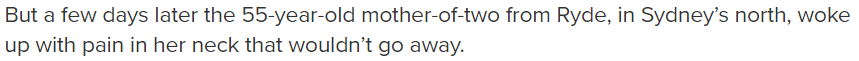 但几天后,这位55岁的母亲,两个孩子的母亲,却震惊地发现她的颈部疼痛一直没有消失。