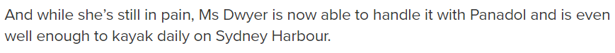 虽然还很痛苦,但Dwyer已经可以用Panadol来对付它了,甚至可以每天在悉尼港划独木舟了。