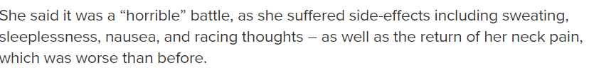 Dwyer说这是一场“可怕的”战斗,因为她遭受了副作用,包括出汗、失眠、恶心、思维混乱,以及颈部疼痛复发,比以前更严重。