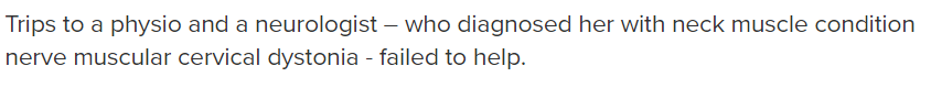 然后她便去看理疗师和神经科医生,医生诊断她患有颈部肌肉疾病、神经肌肉颈部肌张力障碍。