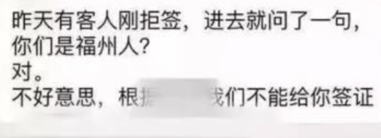 许多旅行社也表示无法帮助福建籍朋友办理签证,因为拒签率太高了。