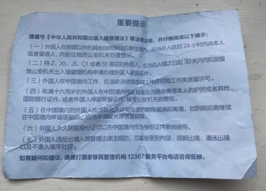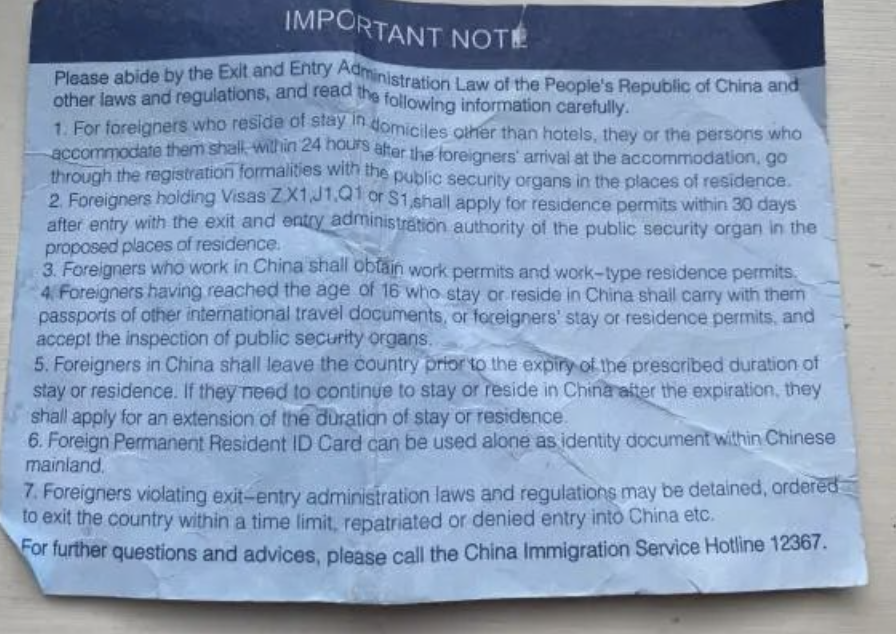 外国人填写中国入境卡时有两联,一联是自己填好进海关时交上;另一联自己保留,上面是外国人入境后注意事项,大家可以看看: