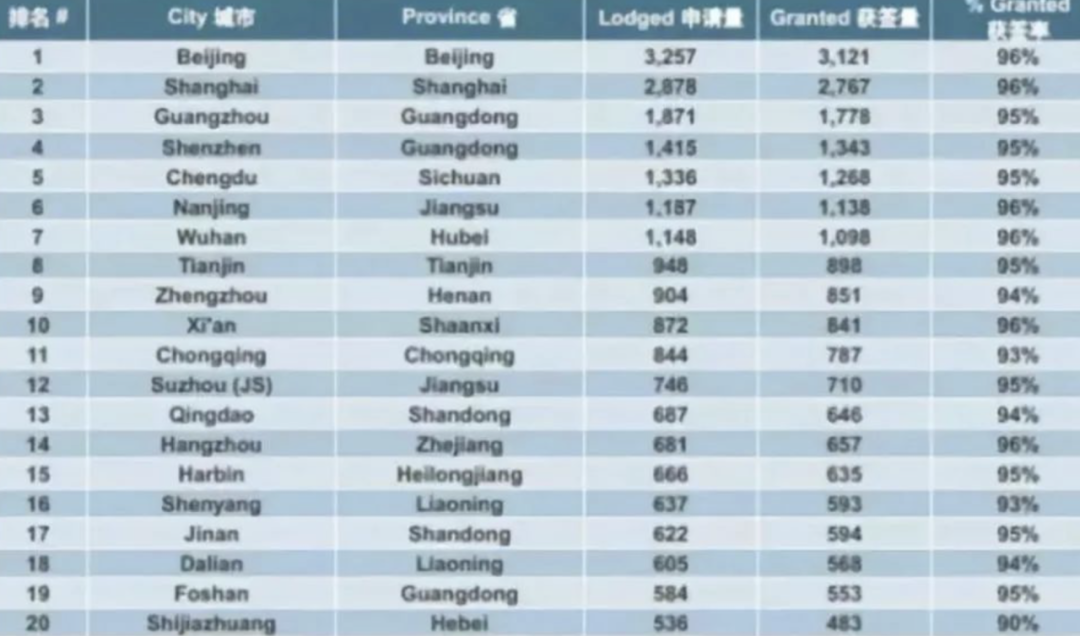 一线城市的申请者相对容易获得签证,而省会的二线城市的批签率也较高。
