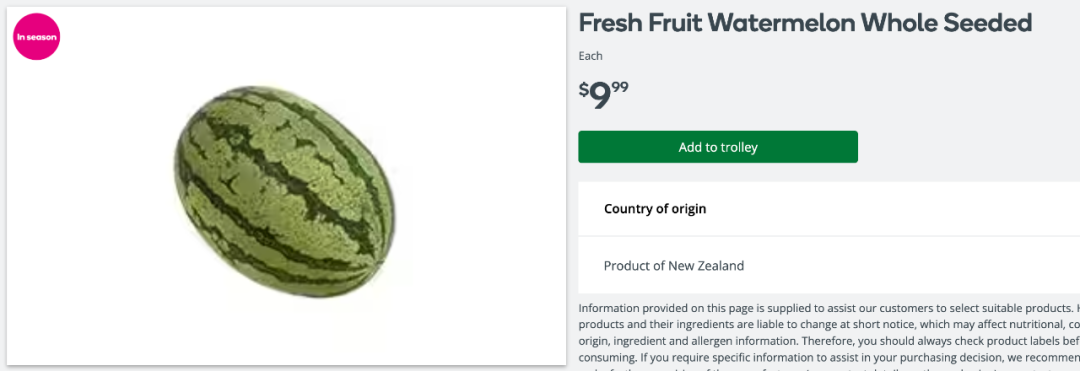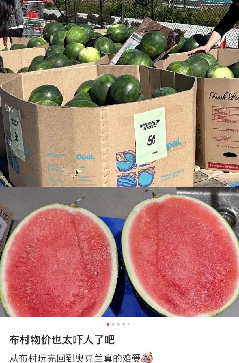 还有人说,新西兰比澳洲物价贵多了。最明显的对比就是西瓜。在澳洲,0.5澳元你可以买一颗大西瓜。