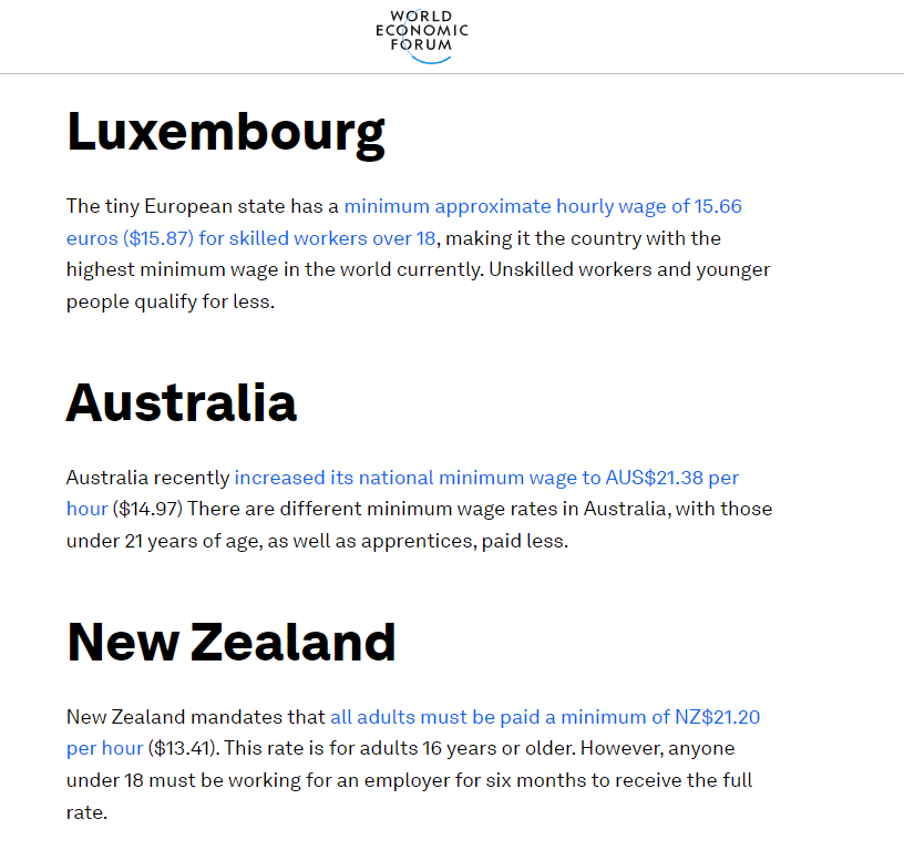 根据世界经济论坛公布的数据,新西兰的最低工资在国际上名列前茅,排世界第三!