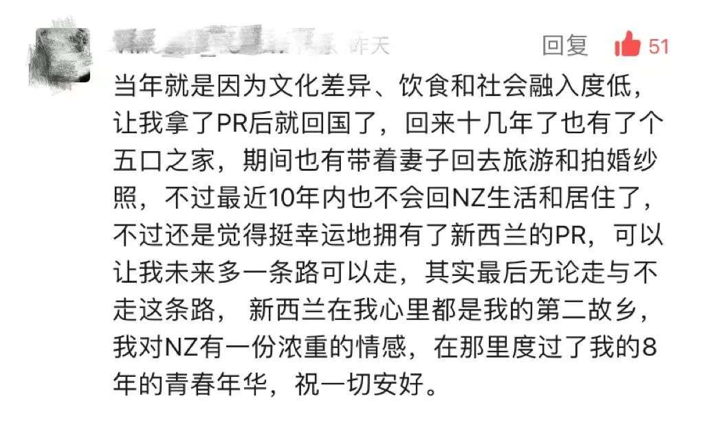 一位天维网友曾在新西兰度过了8年的青春,同时也拿到了PR。后来,他因为“文化差异、饮食和社会融入度低”回中国了。