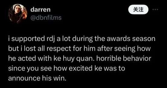 他凭借《奥本海默》获得了最佳男配角,上台领奖时却直接无视了亚裔颁奖嘉宾关继威。唐尼与两位白人嘉宾碰了拳,并未理睬关,甚至连看都没看他一眼。
