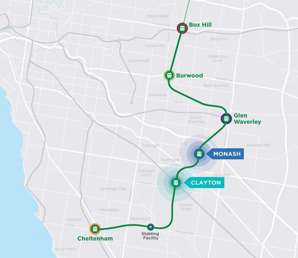 其中Box Hill、Glen Waverley、Clayton和Cheltenham都已有火车站,将在项目完成后升级成为更多条铁路线路的换乘站。