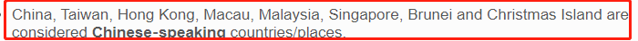 其中,中国大陆、中国台湾、中国香港、中国澳门、马来西亚、新加坡、文莱和圣诞岛被视为汉语国家/地区。