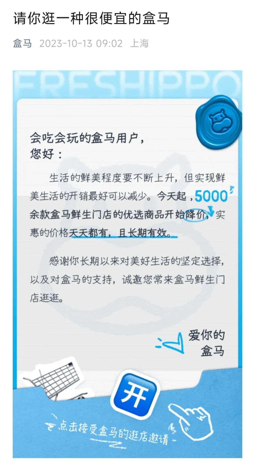 去年10月13日,盒马官方发文表示:“今天起,5000余款盒马鲜生门店的优选商品开始降价,实惠的价格天天都有,且长期有效。”