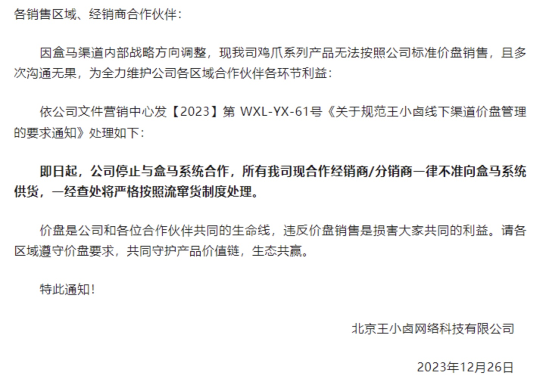 去年12月,王小卤曾经发表声明,称因为盒马压价太过分,放弃向盒马系统供货。
