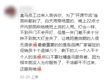 逼员工用商场的厕所,一关门就关灯,退掉品牌厂家留驻的促销员,一个人顶十个人用,都是员工爆料出的盒马苛刻操作。
