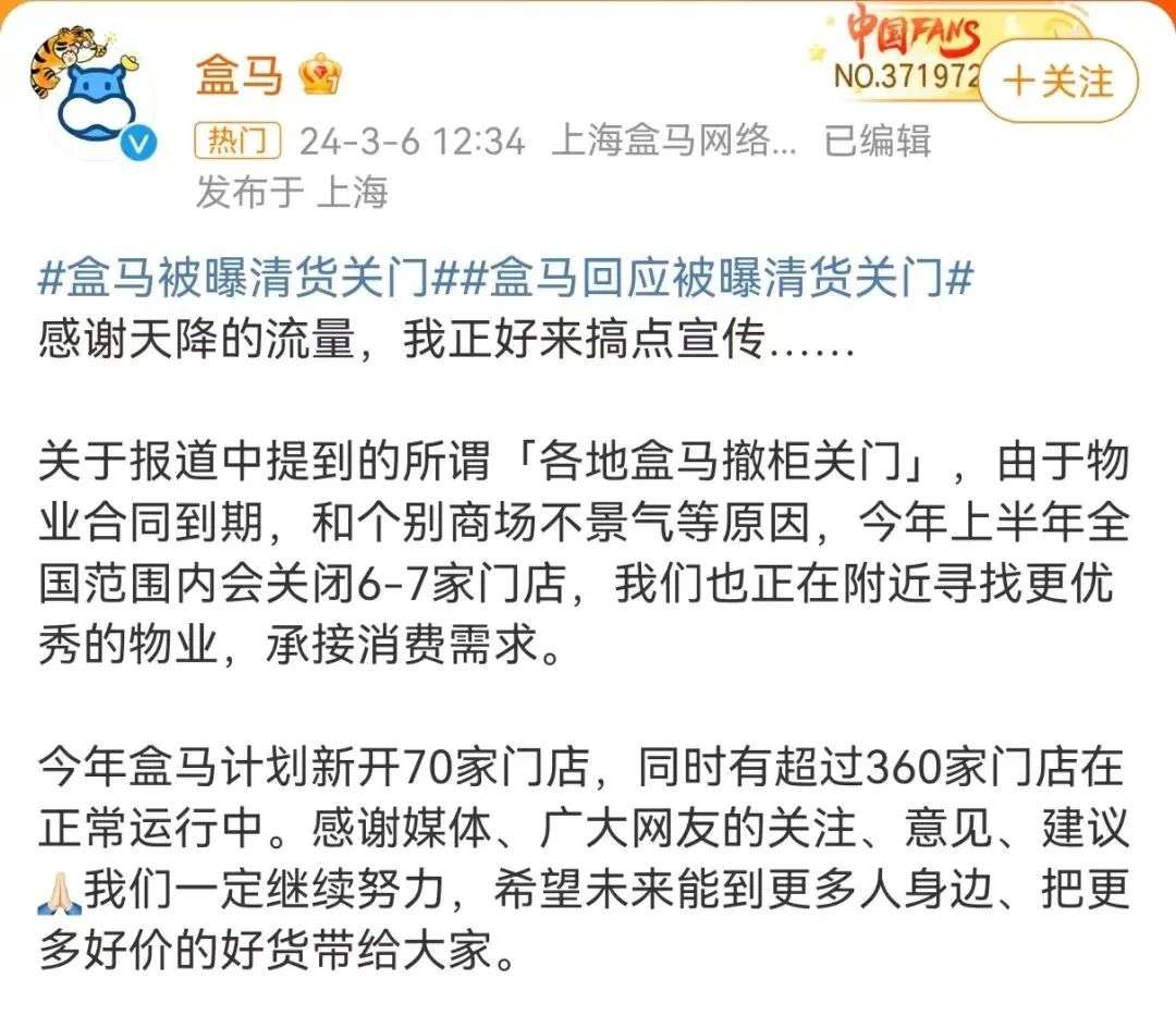 盒马很快发表回应,称这只是策略性调整,并且今年计划新开70家门店。