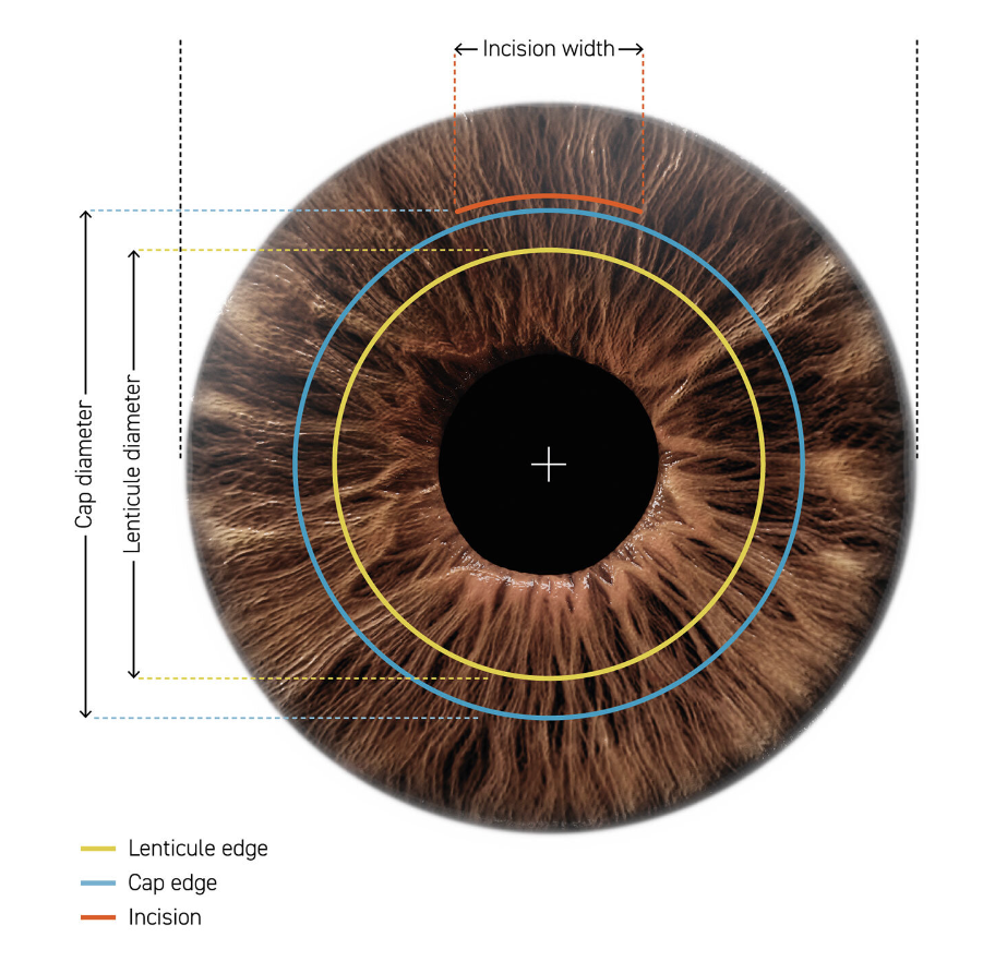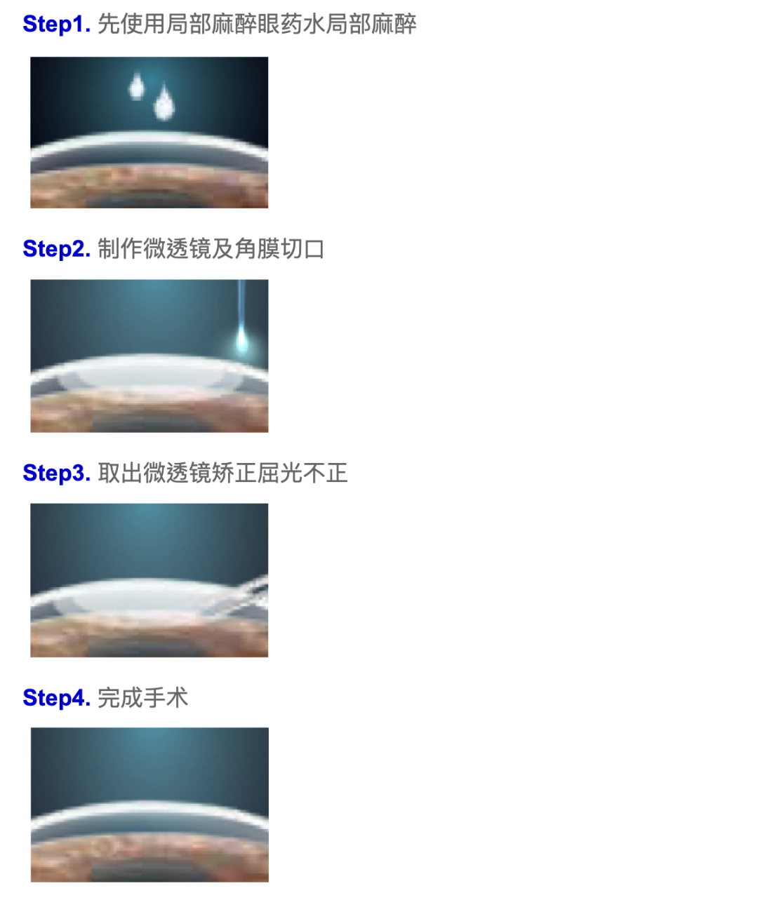该技术使用一束激光在角膜中形成一块非常薄的角膜组织(微透镜),再经由微创切口(3毫米左右)取出,达到屈光矫正的效果。
