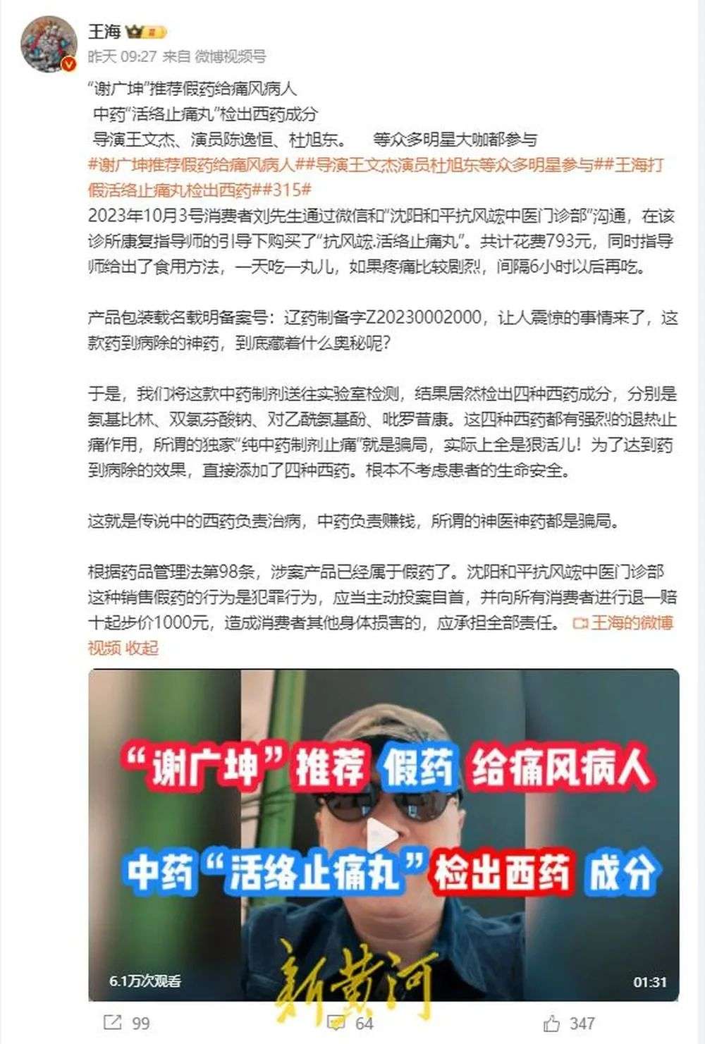 3月14日,职业打假人王海在个人社交平台上爆料称,“沈阳和平抗风竤(hóng)中医门诊部”售卖的“活络止痛丸”检出四种西药成分,“谢广坤”等好几位明星还曾推荐这款药给痛风病人。当日,王海告诉新黄河记者,以上检出的四种西药都具有强烈的退热止痛作用,所谓的“独家纯中药制剂止痛”就是骗局,该门诊部涉嫌售假。