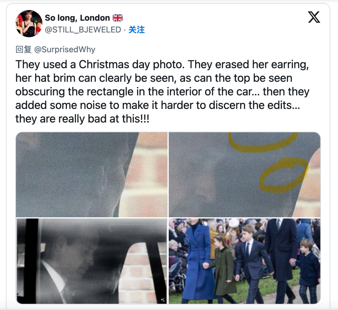 “他们使用了一张圣诞节拍摄的旧照片。他们擦掉了她的耳环,但可以清楚地看到她的帽檐…然后他们添加了一些噪点,让照片变得更难辨别…”