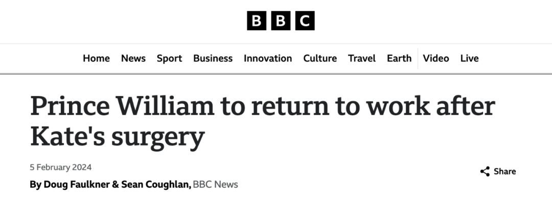 我们首先来看看英媒的报道。BBC 方面在 2 月 5 日曾有过一篇报道,表示凯特王妃出院后一直在家中休养,而请假照顾家人的威廉王子则重返工作岗位。