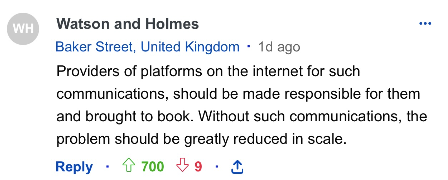“为这些小孩提供交流平台的网络公司们应该被责令对孩子们的行为负责。如果没有这些交流机会,这种行为应该能在很大程度上被制止。”