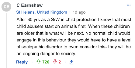 “作为一名在儿童保护机构工作了30年的社工,我了解到多数儿童虐待者最初是在小动物身上实施暴行的。等他们大一点了他们就会这样做。