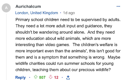 “小学生需要被成年人引导,他们需要大量的成人投入以及指引,他们不该独自四处散漫溜达。他们也需要被教育更多关于野生动物的知识和实践,因为这比电子游戏更有趣。