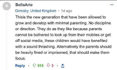 “这就是缺乏家庭教育父母引导的新一代自由发展的样子,他们没有规则或者方向。他们随心所欲因为父母根本没时间抬头从手机或社交媒体中看看他们自己的孩子。这些小孩本应该被好好地打一顿。