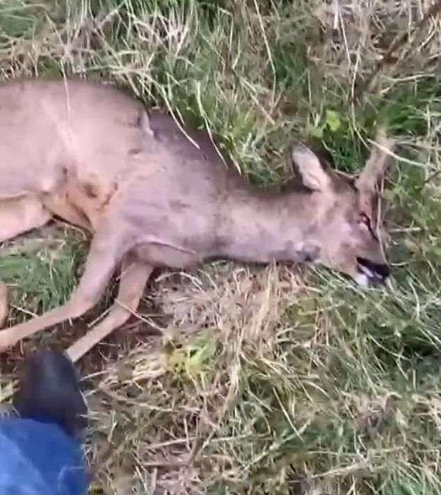 在一个虐杀野鹿的视频中,一只已经倒下的鹿被视频拍摄者用脚踢,导致已经垂死的小鹿在痛苦中在地上扭来扭去。