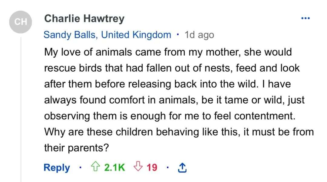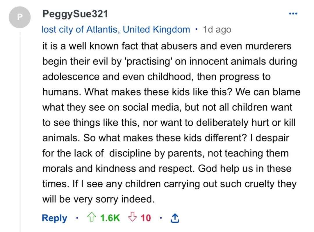 是什么让孩子们变成这样?我们可以责怪未社交媒体上面呈现的东西。但并非所有的孩子都想要看到这样的东西,活着故意伤害杀死动物。所以,到底是什么导致这些虐杀发生呢?我觉得是父母引导的缺乏,父母没有教导他们的小孩什么是道德,善良和尊重。