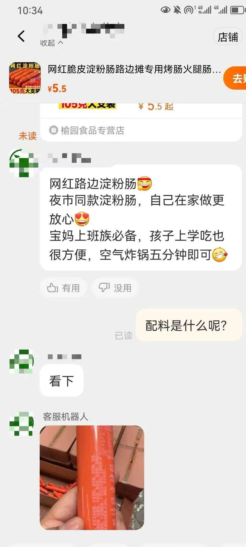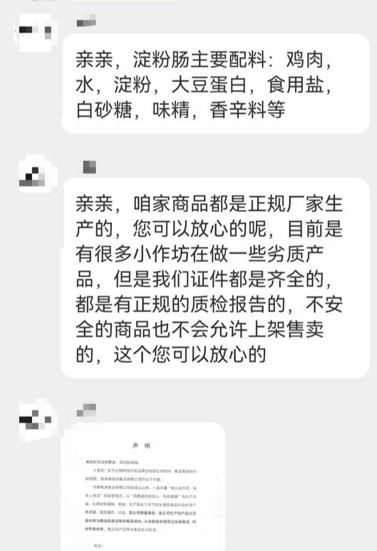 3月18日,记者联系到电商平台上淀粉肠销量较高的商家,客服称自家淀粉肠主要配料有鸡肉,水,淀粉,大豆蛋白,食用盐,白砂糖,味精,香辛料等,并承诺自家商品都是正规厂家生产。“您可以放心的呢,目前是有很多小作坊在做一些劣质产品,但是我们证件都是齐全的,都有正规的质检报告,不安全的商品也不会允许上架售卖。”当被问及是否受到骨泥事件影响,客服称最近仍有大量买家,并将厂家近期发布的声明再次发给消费者,以确保自家淀粉肠的安全性。