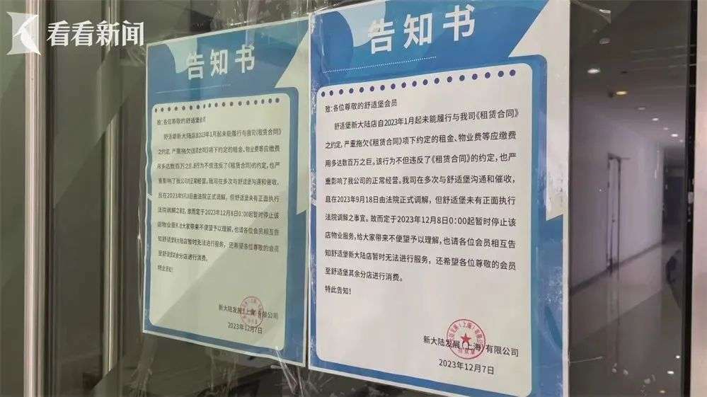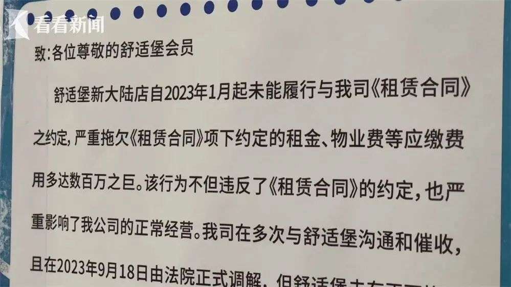 据看看新闻去年12月报道,12月18日记者前往上海多家舒适堡门店探访,有门店拖欠租金、物业费高达数百万。
