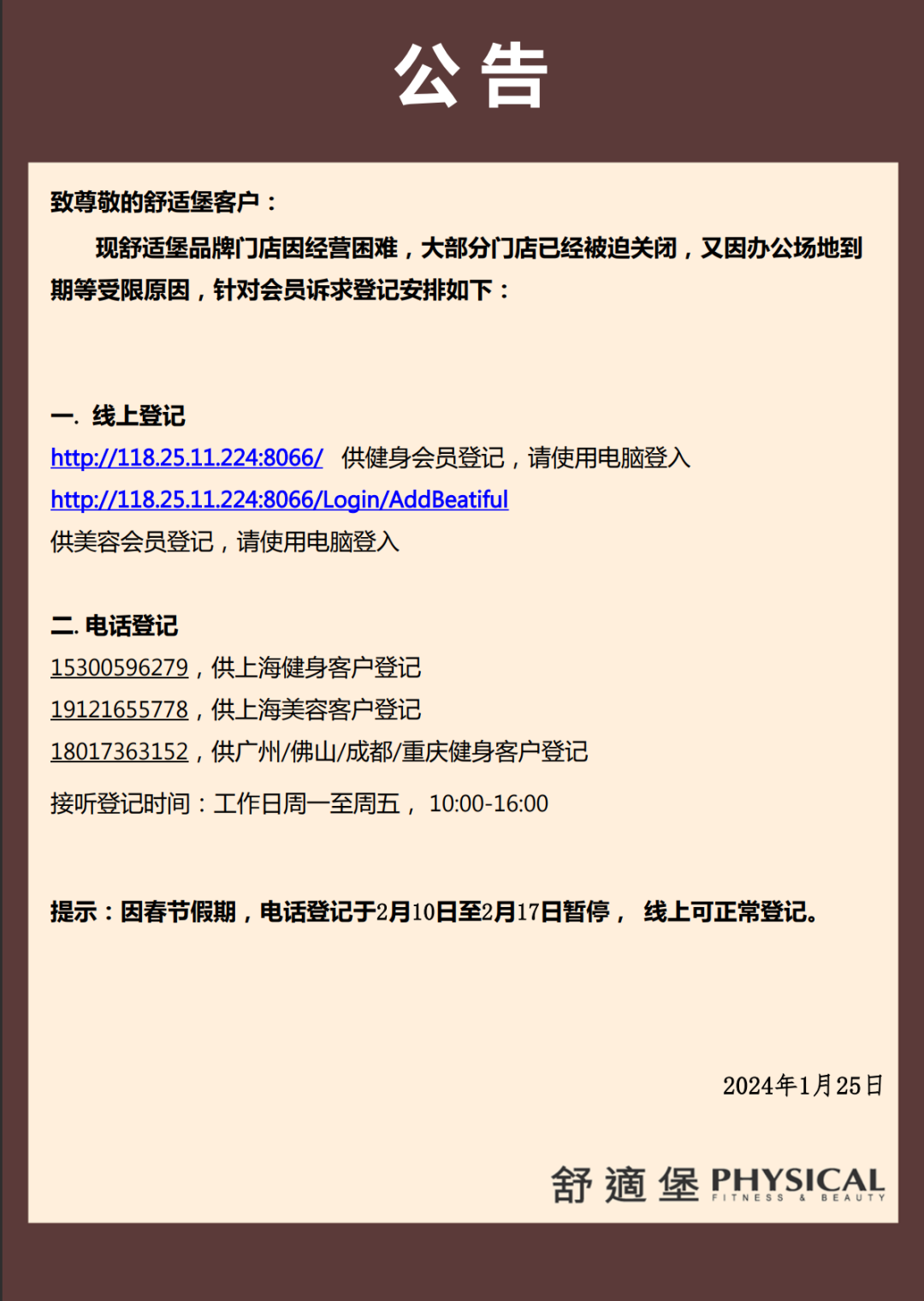 据媒体报道,从去年开始,成都、广州、上海等地都出现了舒适堡健身连锁店陆续关店的消息。舒适堡官方微信号近期的公告称,因经营困难,大部分门店已经被迫关闭,又因办公场地到期等受限原因,针对会员诉求安排线上登记和电话登记,以处理后续事宜。